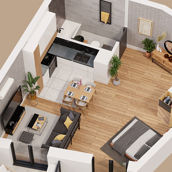 Wytworne części wspólne wykończone naturalnym kamieniem, nastrojowe oświetlenie, stylowe żyrandole – każdy detal tej przestrzeni podkreśla jej prestiżowy charakter. Nowoczesna winda, wózkownia, rowerownia i system monitoringu podnoszą komfort codziennego życia. A możliwość sterowania mieszkaniem z poziomu aplikacji? To luksus, który od teraz masz na co dzień.