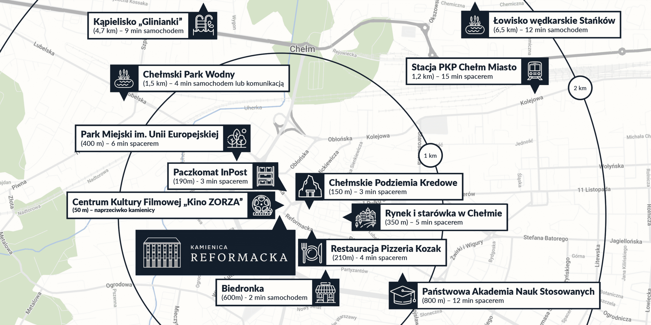 Zamieszkaj w spokojnej okolicy w samym centrum Chełma – tam, gdzie wszystko masz na wyciągnięcie ręki. Kawiarnie, restauracje, sklepy, szkoły, kino czy uczelnia – dosłownie kilka minut spacerem od drzwi Twojego mieszkania. A gdy zapragniesz chwili wytchnienia, wystarczy udać się na krótki spacer, by znaleźć się wśród zieleni parku miejskiego czy historycznych zakątków miasta. Kamienica Reformacka to adres, który daje Ci pełnię możliwości – zarówno do życia, jak i jako przemyślana inwestycja z widokiem na przyszłość.